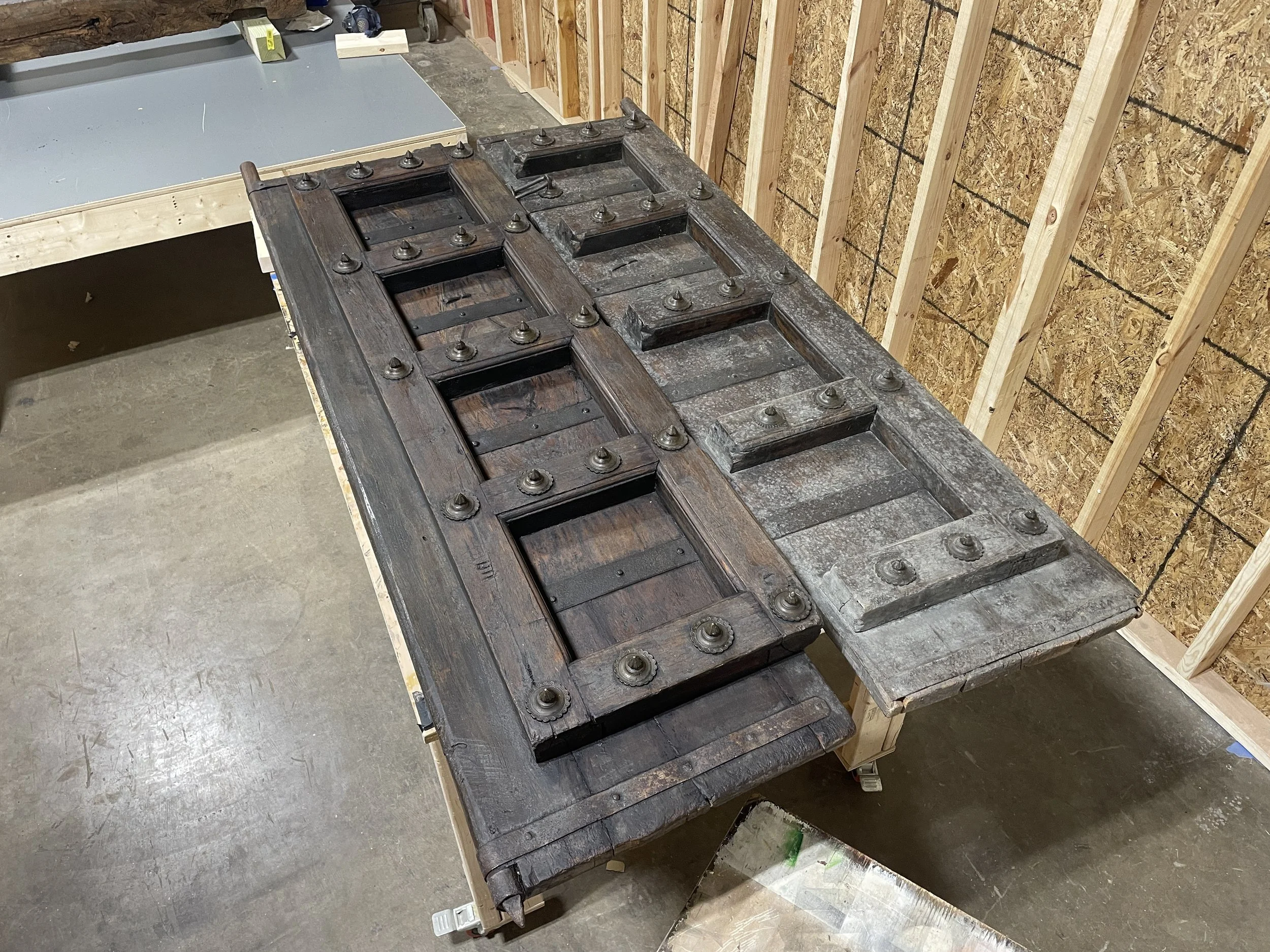 Week of 5/5: Continued testing finishes to determine appropriate sheen—leaning toward matte or dull satin to avoid visual interference from gloss. Goal is to unify surface appearance without detracting from the doors' complex forms. A final topcoat will help even out current uneven sheen from surface wear. Planning to test Kleaevar spray finish. Began fitting and re-fastening Black door frame using large washer-head lag screws.