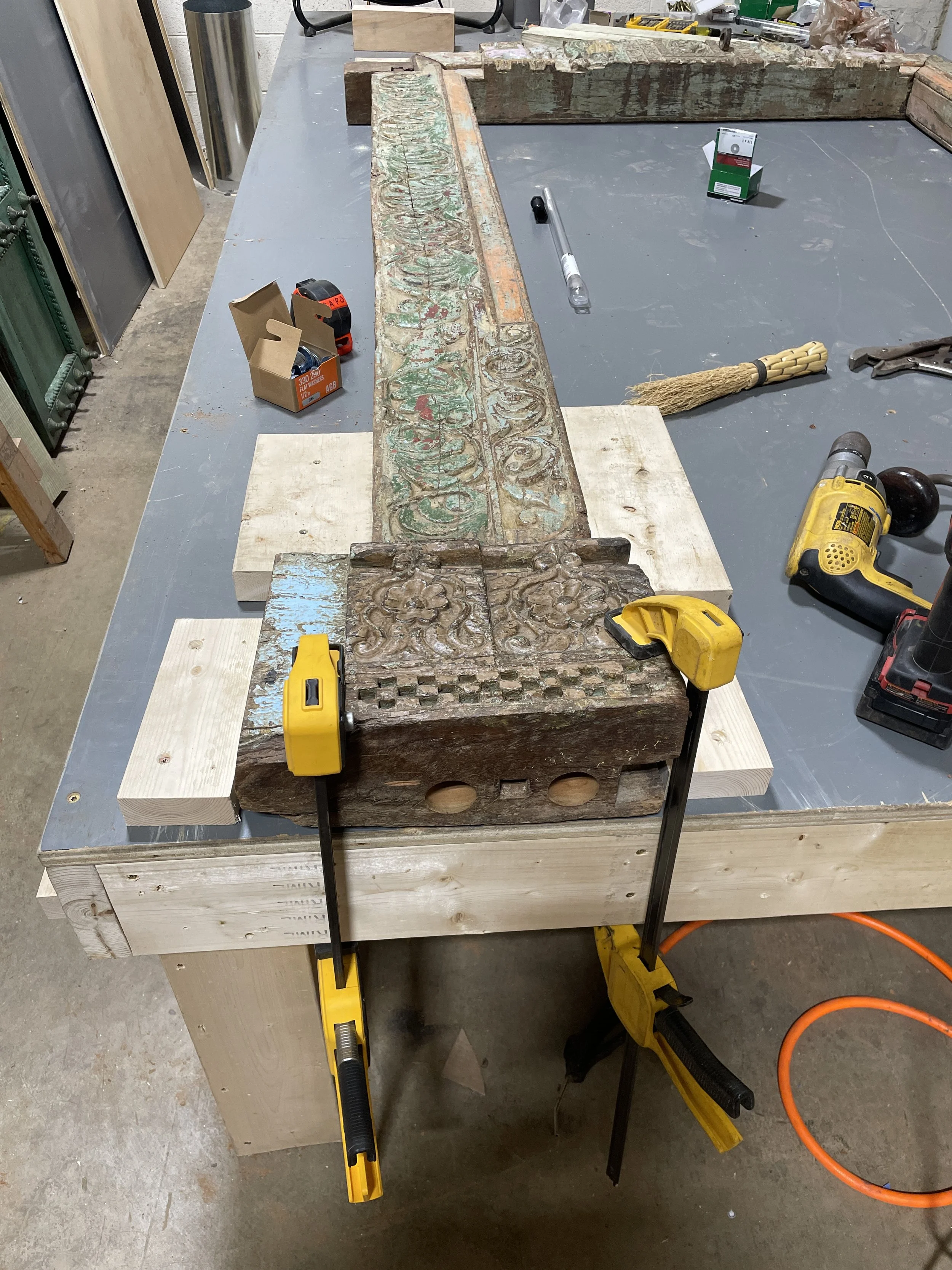Week of 5/27: Finished boring and countersinking remaining holes in the Elephant door frame using a new auger bit, without further issues. Attached unistrut to the back of the Elephant doors to align and unify their front appearance. Installed a temporary threshold on the frame and determined final door placement within it. Repaired a damaged frame tenon using large structural screws.